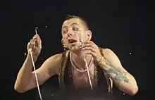 Swallowing a sword attached to a metal bar with weights suspended from it. Glastonbury Festival 2009