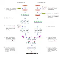 During In vivo Chem-seq,[1] cultured cells in medium are treated simultaneously with either a biotinylated version of the small molecule under study or DMSO (as a control) and 1% formaldehyde for the crosslinking of DNA, proteins and small molecules. DNA is then extracted from the cells, sonicated and enriched for regions containing the biotinylated molecule of interest by incubation with streptavidin magnetic beads, which have a very high affinity for biotin. The enriched DNA fraction is then purified, eluted from the beads and subjected to next generation sequencing. Genomic regions enriched in the Chem-seq library relative to the control are associated with the small molecule under study.