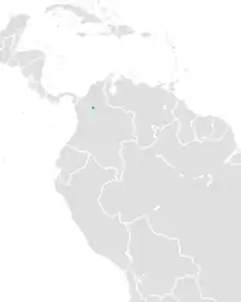 The chestnut-capped piha is endemic to the central Andes of Colombia.[3] It is only found on the northern slope of the Cordillera Central mountains near the towns of Amalfi and Anorí in the department of Antioquia.[3] Sixteen distinct populations are known from this area just east of the Nechí River Valley, with most of the populations being located closer to Anorí, likely due to more extensive habitat destruction over a longer period of time near Amalfi.[10] Despite the large number of populations, in 2014 it was estimated that its surviving habitat only covered between 42 and 357.5 km2 (10,400 and 88,300 acres).[7]