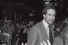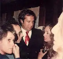 Chase was one of the original cast members of Saturday Night Live (SNL), NBC's late-night comedy television show, beginning in October 1975. During the first season, he introduced every show except two, with "Live from New York, it's Saturday Night!" The remark was often preceded by a pratfall, known as "The Fall of the Week". Chase became known for his skill at physical comedy. In one comedy sketch, he mimicked a real-life incident in which President Gerald Ford accidentally tripped while disembarking from Air Force One in Salzburg, Austria.[24][25] This portrayal of President Ford as a bumbling klutz became a favorite device of Chase's, and helped form the popular concept of Ford as being a clumsy man.[26] In later years, Chase met and became friendly with President Ford.[26][27]