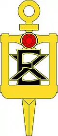 The colors of Chi Epsilon are purple and white.[1] Its badge is a key made in the likeness of the front of a Theodolite or engineer's transit, the instrument of a surveyor. Its publication is The Transit, published semi-annually in the spring and fall of each year.[1]