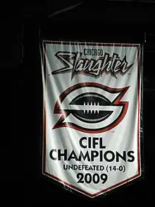 In 2009, the Slaughter signed seven players from the Chicago Rush when the Arena Football League cancelled the 2009 season, including Donovan Morgan, Reggie Gray, Bobby Sippio, and eventual CIFL league MVP Russ Michna.[3] The Chicago Slaughter averaged over 65 points per game and outscored their opponents by almost an average of 30 points per game, going 14-0 for the season. On June 27, 2009, the Slaughter won the CIFL championship.[4]