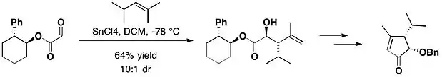 In the total synthesis of (−)-heptemerone B and (−)-guanacastepene E, attached with trans-2-phenylcyclohexanol, the glyoxylate reacted with 2,4-dimethyl-pent-2-ene, in the presence of tin(IV) chloride, yielding the desired anti adduct as the major product, together with a small amount of its syn isomer with 10:1 diastereomeric ratio.[17]