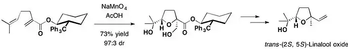 - ↑ Al Hazmi, Ali M.; Sheikh, Nadeem S.; Bataille, Carole J. R.; Al-Hadedi, Azzam A. M.; Watkin, Sam V.; Luker, Tim J.; Camp, Nicholas P.; Brown, Richard C. D. (2014). "trans-2-Tritylcyclohexanol as a Chiral Auxiliary in Permanganate-Mediated Oxidative Cyclization of 2-Methylenehept-5-enoates: Application to the Synthesis of trans-(+)-Linalool Oxide". Organic Letters. 16 (19): 5104–5107. doi:10.1021/ol502454r. PMID 25225741.