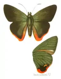 The female butterfly is dark shining green with bluish-grey hairs at the base. forewing with a broad pale cupreous brown band on posterior margin; hindwing with a broad ochreous-red lobular patch with black macular upper border and broad central angular streak.[9]