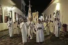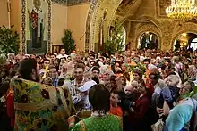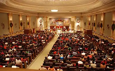 Catholics, Eastern Christians, Lutherans, Anglicans and other traditional Protestant communities frame worship around the liturgical year.[113] The liturgical cycle divides the year into a series of seasons, each with their theological emphases, and modes of prayer, which can be signified by different ways of decorating churches, colors of paraments and vestments for clergy,[114] scriptural readings, themes for preaching and even different traditions and practices often observed personally or in the home.