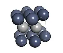 A face-centered cubic (fcc) phase of chromium hydride can also be produced when chromium is electrodeposited. Cloyd A. Snavely used chromate in sugar syrup cooled to about 5 °C and with a current density of 1290 amperes per square meter. The unit cell dimension in the material was 0.386 nm. The material is brittle and easily decomposed by heat. The composition is CrHx, with x between 1 and 2.[2] For current density above 1800 amps per square meter and at low temperatures, the hexagonal close-packed form was made, but if the current was lower or the temperature was higher, then regular body-centered cubic chromium metal was deposited.[6] The condition for preferring the formation of face-centered cubic chromium hydride is a high pH.[3] The fcc form of CrH has hydrogen atoms in octahedral sites in the P63/mmc spacegroup.[5]