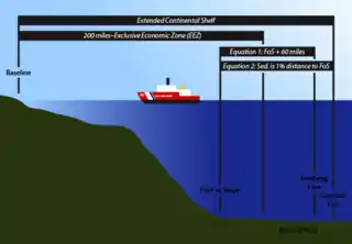 Under the United Nations Convention on the Law of the Sea, party states may submit claims to the Commission on the Limits of the Continental Shelf to extend its continental shelf beyond the 200-mile buffer that comprises a state's exclusive economic zone.[9] This requires that the proposed extension be a natural prolongation of the state's continental shelf, which can be concluded through bathymetric mapping and analysis. If a state can prove that a subsea formation is a natural prolongation of its continental shelf, it must consequently locate the foot of the slope, the physical boundary between the natural prolongation and the abyssal plain of the ocean basin. The foot of the slope is then applied to two equations that inform the claim made by a state for the legal extension of its continental shelf.[9]