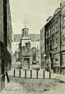 The church escaped the Great Fire of London[9] but fell into disrepair and was rebuilt in brick in 1706, retaining the north wall of the medieval building.[10] The new church was a plain structure, a single space undivided by pillars or columns,[11] 63 feet (19 m) long and 20 feet (6.1 m) wide, built at a cost of £700.[12] The bells were housed in a wooden turret above the projecting porch.[11]