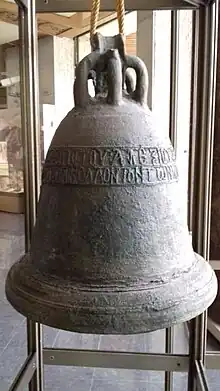 A bronze church bell with a relief Medieval Greek text, considered by Bulgarian researchers to be among the oldest extant church bells in Europe,[3][6][7] was unearthed in Melnik in the 2000s. The inscription prompted the researchers to associate the bell with the Church of St Nicholas. It reads: "Copper-smelted church bell, a gift by Alexius, who is the pious Slav, to Saint Nicholas of Myra".[4] The text is thought to reference Alexius Slav, thus it is dated to his rule and the construction of the bell tower. A very similar bell, also found in Melnik, bears an inscription which mentions Byzantine Emperor Michael VIII Palaiologos (r. 1259–1282) and the year 1270 specifically. However, this second bell may not have belonged to the Church of St Nicholas, but rather to another church in Melnik.[4]