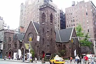 The Gothic Revival church building was constructed in 1844–1845 according to a design by Richard Upjohn, and was consecrated in 1846.[3] In 1853 Upjohn completed the Parish House and Rectory on West 20th Street, and in 1854 he built the Sister's House.[2][3] The design of the church, which features brownstone blocks chosen for placement at random,[3] made the church "one of the most influential buildings of the 19th century".[2] It was: