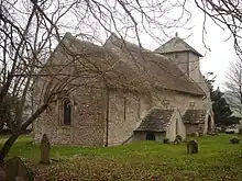 The church is aligned from east to west with its chancel and altar at the east end. It consists of a 12th-century chancel and plain, semicircular chancel arch; a nave of the same age, with two rectangular windows on each side; and a short tower from the 13th century, with two angled buttresses at the southwestern and northwestern corners. The former has a 13th-century gravestone incorporated into the stonework, but the buttresses are no earlier than 14th-century. On the north side is an entrance porch and a vestry.[1] Horsham stone tiles are used for the church and porch roofs and the shallow "Sussex cap"-style roof of the tower.[1][3]