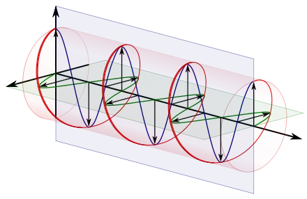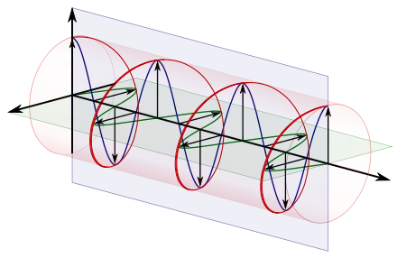 To appreciate how this quadrature phase shift corresponds to an electric field that rotates while maintaining a constant magnitude, imagine a dot traveling clockwise in a circle. Consider how the vertical and horizontal displacements of the dot, relative to the center of the circle, vary sinusoidally in time and are out of phase by one quarter of a cycle. The displacements are said to be out of phase by one quarter of a cycle because the horizontal maximum displacement (toward the left) is reached one quarter of a cycle before the vertical maximum displacement is reached. Now referring again to the illustration, imagine the center of the circle just described, traveling along the axis from the front to the back. The circling dot will trace out a helix with the displacement toward our viewing left, leading the vertical displacement. Just as the horizontal and vertical displacements of the rotating dot are out of phase by one quarter of a cycle in time, the magnitude of the horizontal and vertical components of the electric field are out of phase by one quarter of a wavelength.