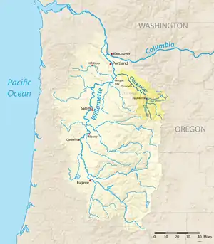The Clackamas River is an approximately 83-mile (134 km) tributary of the Willamette River in northwestern Oregon, in the United States. Draining an area of about 940 square miles (2,435 km2), the Clackamas flows through mostly forested and rugged mountainous terrain in its upper reaches, and passes agricultural and urban areas in its lower third. The river rises in eastern Marion County, about 55 miles (89 km) east-southeast of Salem. The headwaters are on the slopes of Olallie Butte in the Mount Hood National Forest, about 10 miles (16 km) north of Mount Jefferson, at an elevation of 4,909 feet (1,496 m) in the Cascade Range. The Clackamas flows briefly north and then flows northwest through the mountains, passing through North Fork Reservoir and Estacada. It then emerges from the mountains southeast of Portland. It joins the Willamette near Oregon City and forms the boundary between Oregon City and Gladstone.