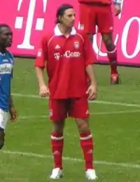 On 26 May 2012, Pizarro signed a one-year contract with his former German team, Bayern Munich.[58] On 31 October, Pizarro scored 2 goals against Kaiserslautern in the DFB-Pokal. In the Champions League match against Lille on 7 November, Pizarro scored a hat-trick within the first 33 minutes of the game as Bayern defeated their French opponents 6–1.[59] On 30 March 2013, Pizarro scored 4 goals, his firsts in the Bundesliga season, and provided two assists in a 9–2 win of Bayern Munich against Hamburg.[60] On 10 April 2013, Pizarro came off the bench to score a 90th-minute goal against Juventus in the quarter-final of the 2012–13 UEFA Champions League, which would end in a 0–2 win for Bayern Munich (0–4 in the aggregate).[61] Pizarro scored twice more and provided a further two assists in Bayern Munich's 6–1 victory over Hannover 96 on 20 April.[62] He finished the 2012–13 season with 13 goals in 28 appearances.[63]