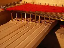 In the clavichord, strings run transversely from the hitchpin rail at the left-hand end to tuning pegs on the right. Towards the right end they pass over a curved wooden bridge. The action is simple, with the keys being levers with a small brass tangent, a small piece of metal similar in shape and size to the head of a flat-bladed screwdriver, at the far end. The strings, which are usually of brass, or else a combination of brass and iron, are usually arranged in pairs, like a lute or mandolin. When the key is pressed, the tangent strikes the strings above, causing them to sound in a similar fashion to the hammering technique on a guitar. Unlike in a piano action, the tangent does not rebound from the string; rather, it stays in contact with the string as long as the key is held, acting as both the nut and as the initiator of sound. The volume of the note can be changed by striking harder or softer, and the pitch can also be affected by varying the force of the tangent against the string (known as Bebung). When the key is released, the tangent loses contact with the string and the vibration of the string is silenced by strips of damping cloth.