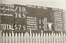 Hill standing in front of the Adelaide Oval scoreboard after scoring 365 against New South Wales in 1900–01
