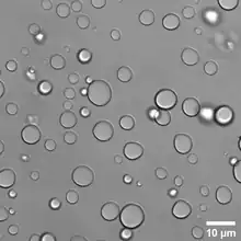 Coacervate (/koʊəˈsɜːrvət/ or /koʊˈæsərveɪt/) is an aqueous phase rich in macromolecules such as synthetic polymers, proteins or nucleic acids. It forms through liquid-liquid phase separation (LLPS), leading to a dense phase in thermodynamic equilibrium with a dilute phase. The dispersed droplets of dense phase are also called coacervates, micro-coacervates or coacervate droplets. These structures draw a lot of interest because they form spontaneously from aqueous mixtures and provide stable compartmentalization without the need of a membrane.