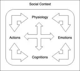 The SPACE model is a bio-psycho-social framework based on cognitive-behavioural psychology.[37][38] Its purpose is to guide the coach in assessing and understanding the behaviour of their clients during specific situations.[37] SPACE is an acronym that stands for Social context, Physiology, Action, Cognition and Emotion.[38] It can be further subdivided into smaller frameworks: ACE and PACE. The ACE framework examines the relationships between the action, emotions and cognitions of the individual.[38] The PACE framework then takes the ACE model and considers the physiological or biological response that accompanies cognitions, emotions and behaviour.[38] Finally, the main SPACE model takes into account the social context in which the behaviour occurs.[37][38]