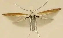 The wingspan is about 11–13 mm. Adults are buff or brown with a white costal streak and some other smaller white streaks. Head white, crown sometimes ochreous-tinged. Antennae white, ringed with dark fuscous, basal joint with rather spreading hairs. Forewings shining yellow -ochreous, slightly brownish-tinged ; a white costal streak from base to near apex ; a short fine line in disc, one along fold, and one along dorsum white, often almost obsolete. Hindwings grey.[2] They are on wing in July in western Europe.[3]