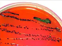 An easy way to differentiate between different types of coliform bacteria is by using an eosin methylene blue agar plate.[12] This plate is partially inhibitory to Gram (+) bacteria, and will produce a color change in the Gram (-) bacterial colonies based on lactose fermentation abilities.[12] Strong lactose fermenters will appear as dark blue/purple/black, and E.coli (which also ferments lactose) colonies will be dark colored, but will also appear to have a metallic green sheen. Other coliform bacteria will appear as thick, slimy colonies, with non-fermenters being colorless, and weak fermenters being pink.