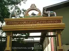 Hindu College Colombo (Tamil: இந்துக் கல்லூரி, கொழும்பு) or abbreviated as HCC is a Tamil language National School situated at Bambalapitiya, in the suburb of Colombo, Sri Lanka. It was founded in 1951. This school was started with the name of "பிள்ளையார் பாடசாலை" (Pillayar Paadasaalai) by Justice C. Nagalingam Q.C. Hindu College Colombo is now considered as one of the most prominent Tamil national schools in the country due to its reputation in the way of providing education.[1] Mr.Nagendra is the current principal of the school, who took charge as the position of principal on 29 May 2023.