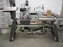 A combination machine is a woodworking machine that combines the functions of two or more separate machines into a single unit. For example, a combination machine might consist of a tablesaw with a side-mounted jointer. Another common example of this type of machine is the jointer-thicknesser (also known as an over-under) which combines the function of a jointer with that of a planer.
