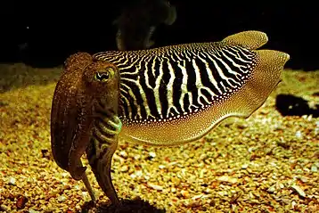 - Agonistic interactions: Male cuttlefish shows a zebra display when sighting a rival male- this display is a signal of fighting intent and the degree of contrast of the pattern signals the strength of the individual.[15]