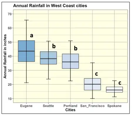 The box plot above, using the CLD methodology, is now far more informative. The cities are sorted in descending order from left to right. The color density is tiered with the cities having higher rainfall being colored with more dense or opaque tones; meanwhile, the cities with lower rainfall have less dense or more transparent tones. Additionally, we can readily identify the cities that have similar rainfall means (not statistically different) such as Seattle & Portland hat are both identified with the "b" letter. Additionally, San Francisco & Eugene also have similar rainfall means as they are both identified with the "c" letter. On the other hand, Eugene has the highest mean rainfall level of them all; and, it is statistically different (higher) than all other cities as it is the only city identified with the letter "a".