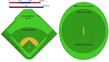 Minimum and example baseball and cricket field dimensions compared at the same scale.
