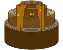 • Wall 3. The third wall is formed by ray cells, which are groups of radiating cells oriented perpendicularly to the stem axis, dividing the stem into segments not entirely unlike the slices of a pie. These groups of cells are not continuous and vary in length, height and thickness, forming a maze-like barrier to tangential spread of decay. After wounding, some ray cells are also altered chemically, becoming toxic to some microorganisms. This is the strongest wall at the time of wounding, prior to the growth of the fourth wall.