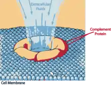 MAC is composed of a complex of four complement proteins (C5b, C6, C7, and C8) that bind to the outer surface of the plasma membrane, and many copies of a fifth protein (C9) that hook up to one another, forming a ring in the membrane. C6-C9 all contain a common MACPF domain.[6] This region is homologous to cholesterol-dependent cytolysins from Gram-positive bacteria.[7]