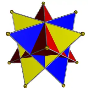 In geometry, a compound of three tetrahedra can be constructed by three tetrahedra rotated by 60 degree turns along an axis of the middle of an edge. It has dihedral symmetry, D3d, order 12. It is a uniform prismatic compound of antiprisms, UC23.