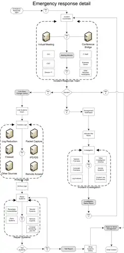 Incident management requires a process and a response team which follows this process. This definition of computer security incident management follows the standards and definitions described in the National Incident Management System (NIMS). The incident coordinator manages the response to an emergency security incident. In a Natural Disaster or other event requiring response from Emergency services, the incident coordinator would act as a liaison to the emergency services incident manager.[2]
