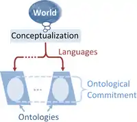 In information science a conceptualization is an abstract simplified view of some selected part of the world, containing the objects, concepts, and other entities that are presumed of interest for some particular purpose and the relationships between them.[2][3] An explicit specification of a conceptualization is an ontology, and it may occur that a conceptualization can be realized by several distinct ontologies.[2] An ontological commitment in describing ontological comparisons is taken to refer to that subset of elements of an ontology shared with all the others.[4][5] "An ontology is language-dependent", its objects and interrelations described within the language it uses, while a conceptualization is always the same, more general, its concepts existing "independently of the language used to describe it".[6] The relation between these terms is shown in the figure to the right.