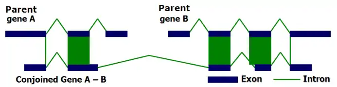 - ↑ Prakash T, Sharma VK, Adati N, Ozawa R, Kumar N, et al. (October 2010). Michalak P (ed.). "Expression of Conjoined Genes: Another Mechanism for Gene Regulation in Eukaryotes". PLOS ONE. 5 (10): e13284. Bibcode:2010PLoSO...513284P. doi:10.1371/journal.pone.0013284. PMC 2953495. PMID 20967262.