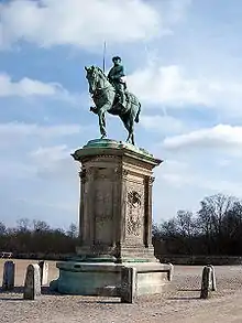 The Château of Écouen was built under his direction beginning in 1538, meanwhile Chantilly was restored at his request from 1527-1532. Écouen was a testament to the new architectural style of the period, and was renowned for its beauty, it featured sculpture work by Jean Goujon (such as the sculpture of victory wielding the sword of the Constable, which hung over the fireplace) with the architecture overall led by Jean Bullant.[51][52][53] Écouen featured two statues by Michelangelo that had been gifted to Montmorency by François I (originally destined for the tomb of Pope Julius II), along with mosaics of coloured stones and an elaborate courtyard. The emblems of Henri II, Catherine de Medici and his own would be strewn throughout the château.[54] Chantilly was so grand it rivalled a royal palace, the original feudal centre of the château renovated inside in the style of the Renaissance. Beginning in 1524 Montmorency added a long gallery to the château.[55] A small châtelet (gatehouse) was added at the level of the pond.[52]