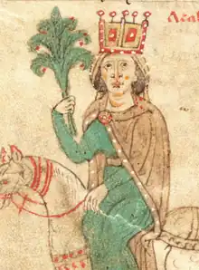 In May 1198, Constance had the three-year-old Frederick crowned King of Sicily with herself as regent. After Henry's death, initially she had upheld for her son the double title Romanorum et Sicilie Rex, but she abandoned the German claim after the coronation of Frederick in Palermo, May 1198.[20] According to Kölzer, the Pope had put pressure on Constance and Frederick to abandon the title.[19] Additionally, the death of Henry had left in Germany a power vacuum that a child monarch could not fill. Constance likely realized that Frederick's perspective in Germany was hopeless and supported the claims of her brother-in-law Philip of Swabia, who was supported by a number of the princes against the Welf candidate, Otto IV.[21][22]