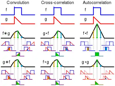 Visual comparison of convolution, cross-correlation, and autocorrelation. For the operations involving function f, and assuming the height of f is 1.0, the value of the result at 5 different points is indicated by the shaded area below each point. The symmetry of f is the reason and are identical in this example.