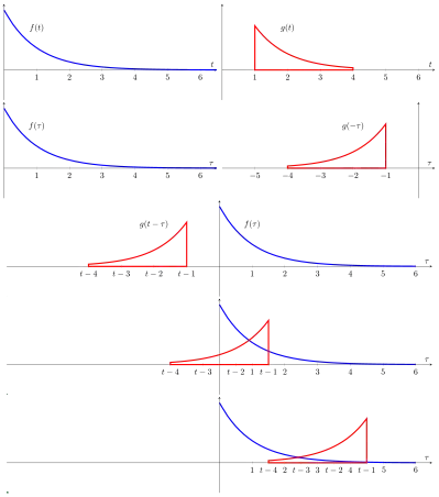While the symbol t is used above, it need not represent the time domain. At each t, the convolution formula can be described as the area under the function f(τ) weighted by the function g(−τ) shifted by the amount t. As t changes, the weighting function g(tτ) emphasizes different parts of the input function f(τ); If t is a positive value, then g(tτ) is equal to g(−τ) that slides or is shifted along the -axis toward the right (toward +∞) by the amount of t, while if t is a negative value, then g(tτ) is equal to g(−τ) that slides or is shifted toward the left (toward -∞) by the amount of |t|.