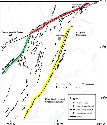 The Border Ranges Fault system is a normal-oblique fault and stretches 1,500 mi on the eastern side of the basin. It separates the forearc basin from the subduction complex as well as deformed metamorphic rocks from the subduction complex.[4] The Fault system originated during the pre-miocene period as a result of megathrust subduction and it was subsequently filled with turbidity deposits. Since then, it underwent contractional deformation in the Cretaceous and Paleocene-Eocene due to strike-slip movements.[1]