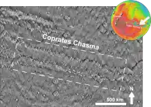 Coprates Chasma (/ˈkɒprətz ˈkæzmə/) is a huge canyon in the Coprates quadrangle of Mars, located at 13.4° south latitude and 61.4° west longitude, part of the Valles Marineris canyon system. It is 966 km (600 mi) long and was named after a classical albedo feature name.[1] It was named from the classical Greek name for the Dez River in Persia.