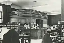 The library has high ceilings and windows. The basement ceilings are 3.7 metres (12 ft), while the main floor ceilings are 5.5 metres (18 ft).[6] The main floor has built-in perimeter bookshelves. Reading areas include partial wall and screened wall areas. The lower level is reached via stairs from the front vestibule. A central hallway in the basement separates lecture rooms. Interior doors are made of oak and glass. Other interior features include solid, wide, oak tables,[5] wood panelling, and tiled fireplaces with oak mantels.[6]