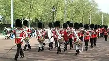 The Corps of Drums of 1st Battalion Grenadier Guards marching away from the forecourt of Buckingham Palace.