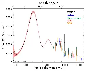Inspired by the COBE results, a series of ground and balloon-based experiments measured cosmic microwave background anisotropies on smaller angular scales over the next decade. The primary goal of these experiments was to measure the scale of the first acoustic peak, which COBE did not have sufficient resolution to resolve. This peak corresponds to large scale density variations in the early universe that are created by gravitational instabilities, resulting in acoustical oscillations in the plasma.[43] The first peak in the anisotropy was tentatively detected by the Toco experiment and the result was confirmed by the BOOMERanG and MAXIMA experiments.[44][45][46] These measurements demonstrated that the geometry of the universe is approximately flat, rather than curved.[47] They ruled out cosmic strings as a major component of cosmic structure formation and suggested cosmic inflation was the right theory of structure formation.[48]