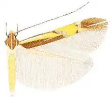 Male, female. Forewing length 4.1 mm. Head: frons shining pale ochreous with greenish and reddish reflections, vertex pale ochreous-yellow, neck tufts shining bronze brown with reddish gloss, laterally and medially lined white, collar shining bronze brown; labial palpus first segment very short, white, second segment four-fifths of the length of third, dark brown with white longitudinal lines laterally and ventrally, third segment white, lined brown laterally; scape dorsally dark brown with white anterior and dorsal lines, ventrally yellowish white, antenna shining dark brown with a white line from base to two-fifths, changing into an interrupted line to beyond one-half, followed towards apex by an annulate part of ten segments, twelve dark brown, one white, one dark brown, two white, two dark brown, two white, ten dark brown, three white and three dark brown segments at apex. Thorax and tegulae shining yellowish brown with reddish gloss, thorax with a white median line, tegulae lined white inwardly. Legs: shining dark greyish brown with reddish gloss, femora yellowish white, foreleg with a white line on tibia and tarsal segments one, two, three (only basal half) and five, tibia of midleg with white narrow oblique basal and medial streaks and a white apical ring, tarsal segments ochreous, segments one and two each with a dark brown basal spot dorsally and segment four entirely ochreous-brown, tibia of hindleg as midleg, but with an additional subapical oblique white streak, tarsal segments ochreous, segment one greyish brown at base and with a very oblique greyish-brown streak laterally on the outside, segments two and three each with a dark brown basal spot dorsally, spurs shining white. Forewing shining bronze brown, costal half of the basal area pale yellow except at costa and strongly narrowing just prior to the transverse fascia, four white lines in the basal area, a costal from two-fifths to the transverse fascia, a broad subcostal at the costal side of the pale yellow section from base nearly to the end of this section, a slightly oblique subdorsal from two-fifths to one-half, a narrow dorsal from base to one-quarter, a pale yellow transverse fascia beyond the middle, narrowing towards dorsum, bordered at the inner edge by a tubercular very pale golden metallic, outwardly oblique fascia with pinkish reflection, not reaching costa and with a very small patch of blackish scales on the outside above middle, bordered at the outer edge by a similarly coloured but narrower, slightly inwardly oblique, fascia, inwardly lined dark brown at costa and dorsum, both fasciae narrowed in the middle and with their widest parts on dorsum, beyond the outer fascia a narrow pale yellow spot on costa and a triangular pale yellow spot on dorsum, outer fascia outwardly edged by a whitish costal streak, a broad white apical line from the middle of the apical area, cilia bronze brown around apex, greyish brown towards dorsum. Hindwing shining pale ochreous-brown, cilia greyish brown. Underside: forewing shining greyish brown, the white apical line visible, hindwing shining greyish brown in costal half, greyish white in dorsal half. Abdomen dorsally shining pale yellow, segments banded shining white posteriorly, ventrally shining white, anal tuft shining white.[1]