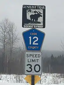 County State-Aid Highway 12 (CSAH 12), also known as the Gunflint Trail, or County Road 12 (CR 12), is a 57-mile (92 km) paved roadway and National Scenic Byway in Cook County, Minnesota, that begins in Grand Marais and ends at Saganaga Lake in the Boundary Waters Canoe Area Wilderness (BWCAW), near the U.S. border with Ontario. It provides access to many of the entry points in the BWCAW.