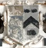 Arms of Sir John Davie, 1st Baronet (1588–1654) of Creedy: Azure, three cinquefoils or on a chief of the last a lion passant gules impaling: Argent, a chevron between three conies courant sable (Strode of Newnham). Detail from mural monument to his wife Juliana Strode (died 1627), Sandford Church