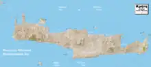 The earliest references to the island of Crete come from texts from the Syrian city of Mari dating from the 18th century BC, where the island is referred to as Kaptara.[6] This is repeated later in Neo-Assyrian records and the Bible (Caphtor). It was known in ancient Egyptian as Keftiu or kftı͗w, strongly suggesting a similar Minoan name for the island.[7]