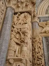 Although the main portal of Trogir cathedral was not completed until the 14th century, it is clearly Romanesque in form, but with a new Gothic humanist tendency in the carvings.[8] The date for the portal is generally given as 1240, which is when Master Radovan carved his name as part of the latin inscription. The portal has a semi-circular tympanum set within a recessed frame with rounded arches in the Romanesque style. The large main figures are sculptures of Adam and Eve, borne on lions supported by plinths. Scenes from the life of Christ from the Annunciation to the Resurrection appear in the arches above the door, with the Nativity occupying the central position of the tympanum, which was unusual for the time. It is a reflection of the spirit of the new Gothic age to replace the dire warning of the Last Judgement above the doorway, with a message of love and hope.[8]